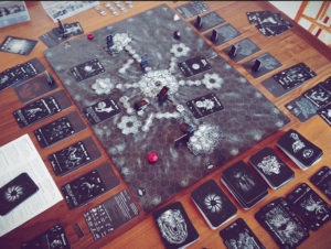 Cave Evil es un juego de eliminación salvaje para 2 a 4 jugadores de 14 años en adelante. Cada jugador es un antiguo nigromante no muerto que compite para emplear el poder del Foso, la fuente de la Sombra Infinita. Solo un nigromante tendrá éxito. Todos los demás serán aniquilados. Los nigromantes empiezan la partida en guaridas cerca del Foso. Utilizando vilmetal, vísceras, y llamaoscura, invocan a sus esbirros. Con la ayuda de estos esbirros, excavan túneles para localizar otras criaturas, recursos y objetos valiosos para ganar el control del Foso u otros portales de invocación. Pero el mal acecha y los jugadores no están solos… cuando el Mal Eterno se revele, el final de todos estará muy cerca…