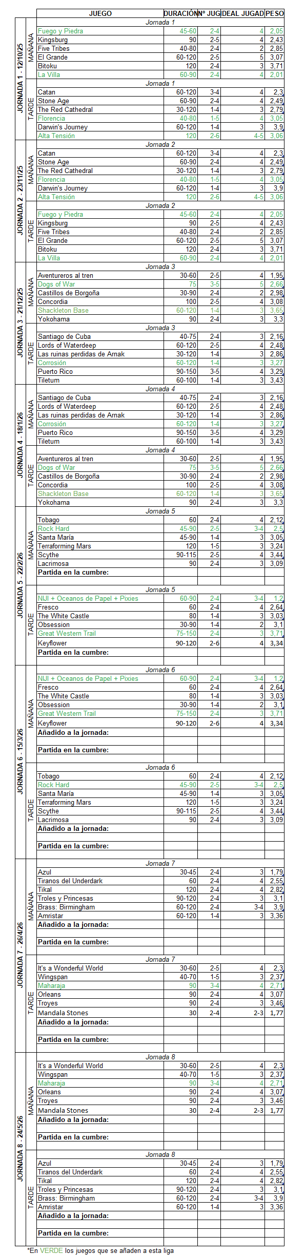 Cada jornada cuenta con dos turnos: El turno de mañana y el turno de tarde. Se puede acudir a ambos turnos si se desea. De cara a puntuar en la liga únicamente es necesario jugar un total de 8 partidas. Si se juegan más va en beneficio del jugador. Si se juegan menos tampoco pasa nada, no nos importa que simplemente quieras venir a probar juegos.